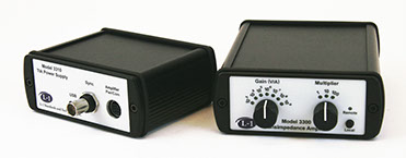 The computer interface is routed through a TIA power supply module. There are two module types. Model 3310 TIA Power Supply powers one TIA and supports USB communications with a Windows based computer, while Model 3311 TIA Quad Power Supply powers up to four TIAs and supports both USB and Ethernet communications. A 9-pin Mini DIN cable from a TIA power module routes both power and data to an amplifier. All data transfers are ASCII text based. To minimize the effects of ground loops, there is galvanic isolation between the TIA analog ground and the ground references of the USB, Ethernet, and line power cables.