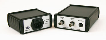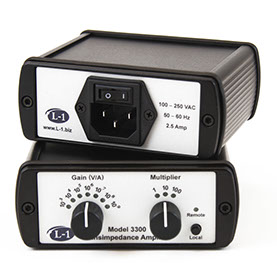 The L-1 Standards Model 3300 trans-impedance amplifier is a precision electronic instrument designed to measure photocurrents to very low uncertainties for the most demanding optical metrology applications. The amplifier senses the current flowing into/out of its input, which is held at constant potential (virtual ground), and supplies a proportional analog potential at its output. There is an internal analog-to-digital convertor that can be used in-lieu of an external voltmeter to measure the output potential. The amplifier has 11 effective gains that may be set via front panel controls or remotely through a USB or Ethernet computer interface.